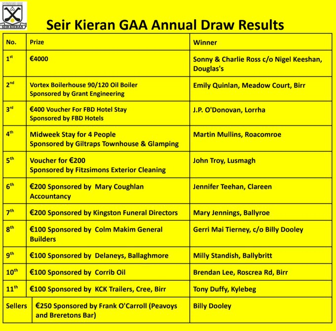 Seir Kieran GAA Annual Draw Results.Massive thanks to everyone who help make our draw a success every year. The video of our annual draw is available to view on our Facebook page.