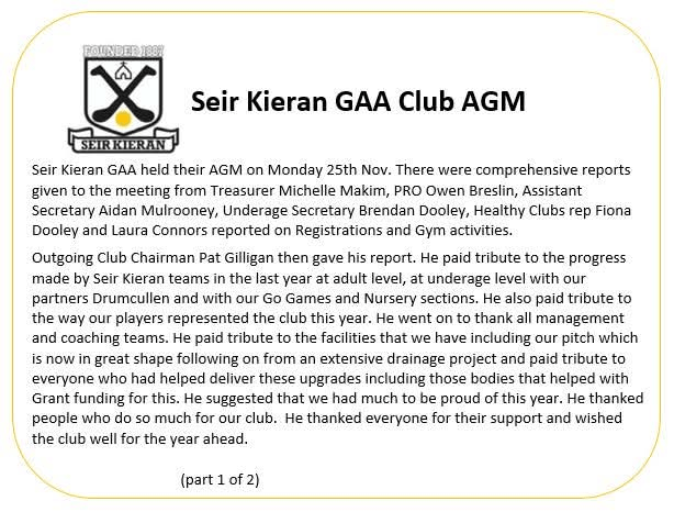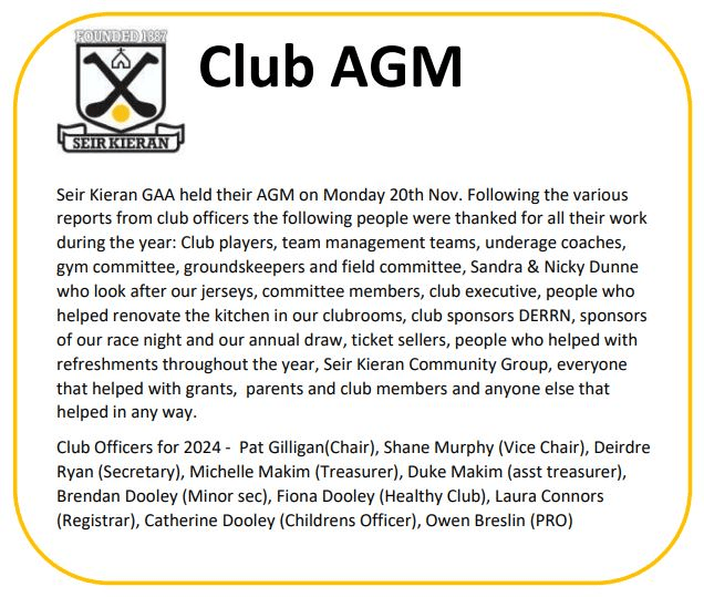 Seir Kieran GAA invite you to our AGM on Fri 21st Nov at 8pm in the clubrooms. Have your voices heard. Its important that people use this chance to have their say and to hear about the running of our club. Any motions or nominations should be submitted prior to the meeting.