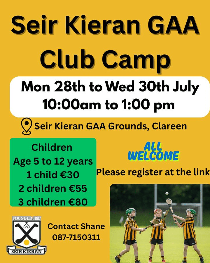 Seir Kieran GAA are delighted to announce that we will host a Summer GAA Club camp for children aged 5 to 12 years old. It takes place Mon July 28th to Wed July 30th.