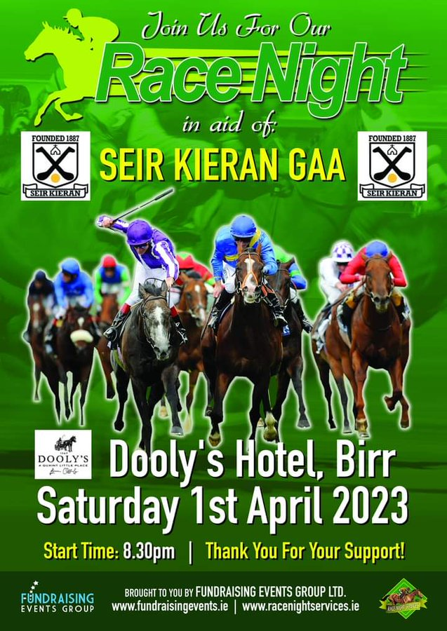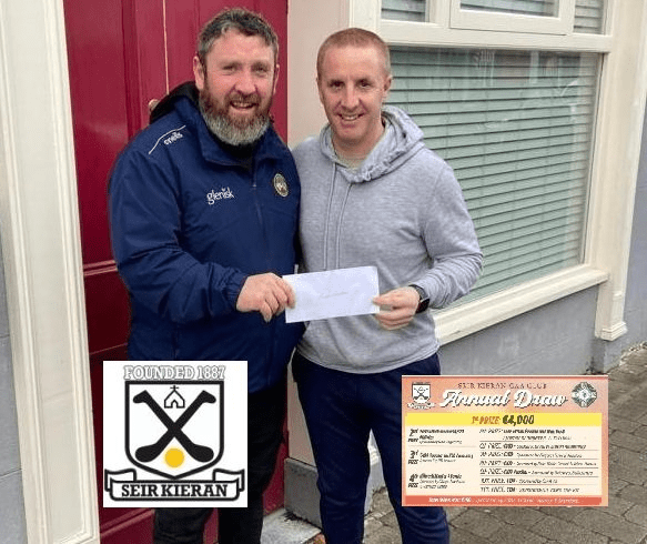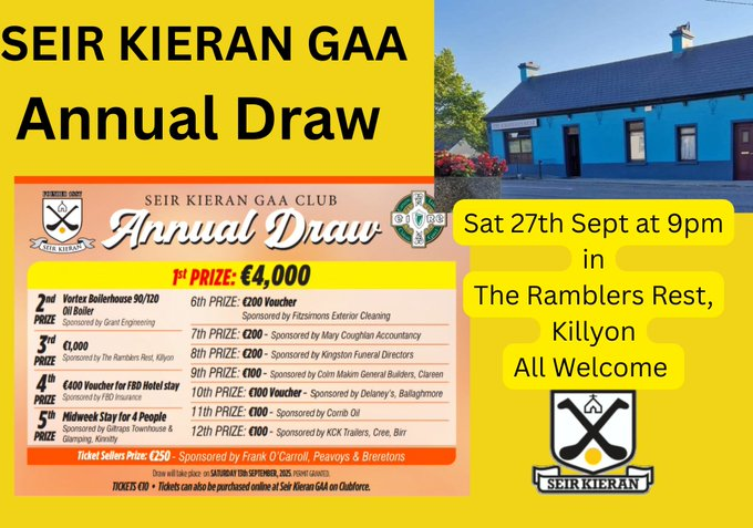 Seir Kieran Annual Draw takes place on Sat 23rd Sept. 1st Prize has been increased to €4000 and there are loads of other excellent prizes to be won. Tickets cost €10 and are available from sellers as well as online. All support greatly appreciated