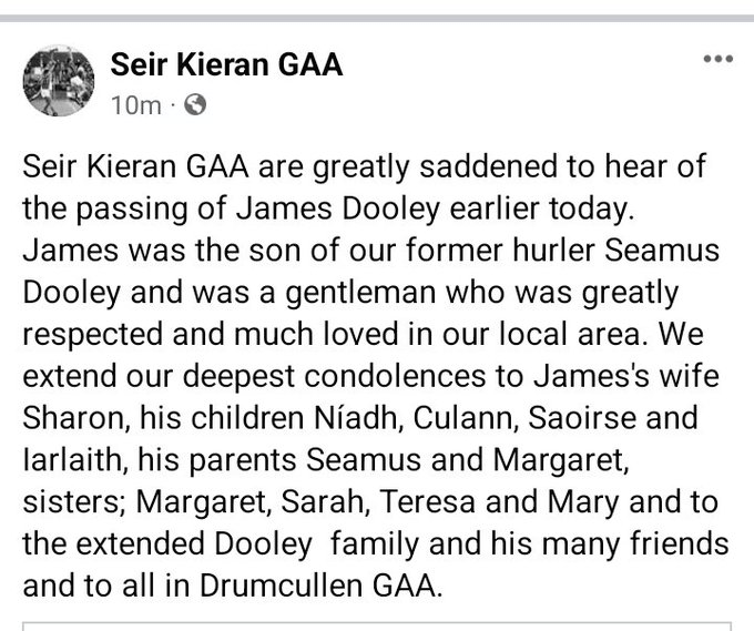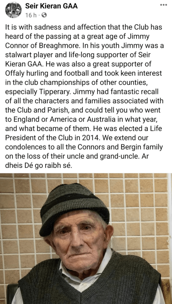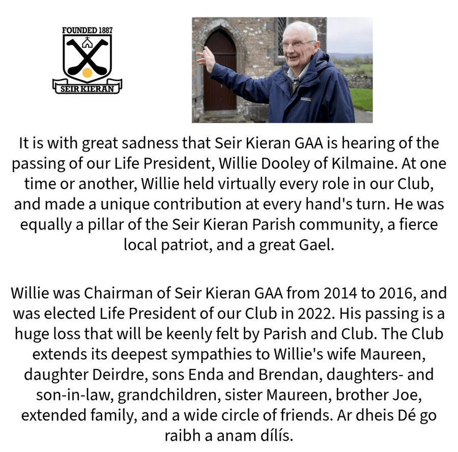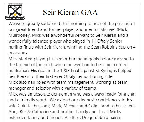 Seir Kieran GAA are greatly saddened to hear of the passing of our great friend and former player and Mentor Michael (Mick) Mulrooney.