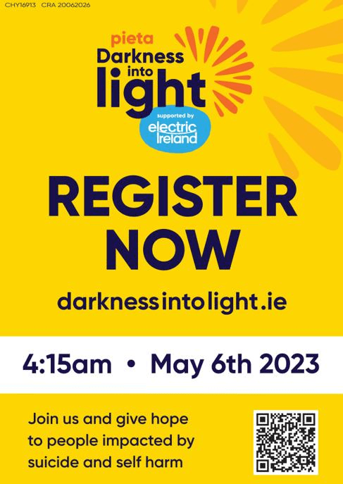 As part of GAA healthy clubs, Seir Kieran GAA are pleased to host the Darkness into Light sunrise walk in aid of Pieta House. This year’s Darkness Into Light, proudly supported by Electric Ireland, is on Saturday May 6th.