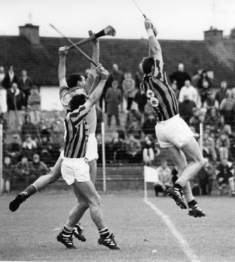 Then the Limerick defence, mindful perhaps of Billy Dooley’s depredations in each championship game so far, floored Offaly’s No. 13. As Johnny Dooley calmly stood over the ball on the 21 yard line, Derry O’Donovan signaled that a point would be the best option. However, Dooley had already made up his mind to go for goal, without taking a run at it. Suddenly it was a two-point game. Limerick goalkeeper Joe Quaid took a quick puck out, but it was Offaly’s Michael Duignan who won possession and sent to Johnny Pilkington. Pilkington lobbed back in ahead of the inrushing Pat O’Connor, and the Coolderry man doubled on it to put Offaly one point ahead. Offaly’s well-oiled conveyor belt of points suddenly clicked into high gear. Johnny Dooley and John Troy effortlessly found the target, and Billy Dooley sent over three in succession from the sideline by the Cusack Stand.